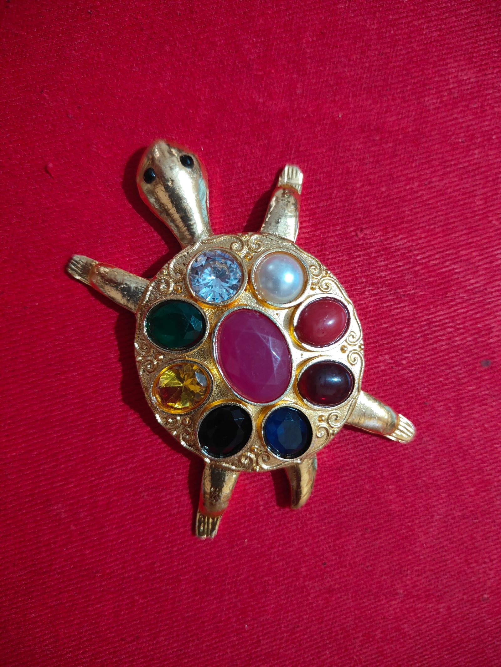 Nav Grah Kachhap is a sacred turtle-shaped ornament embedded with nine auspicious gemstones, each representing one of the nine planets in Vedic astrology, believed to balance planetary influences and bring harmony, prosperity, and protection to the wearer or space.